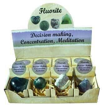 Box of 12 Box of 12 Fluorite .Decision making, Concentration, Mediation. You get 12 various shapes, heart, sphere, natural formation, and pyramid, comes in large display box, each stone also has it’s own nifty little individual display box, 2 nestled in a bed of wood shavings. From China.